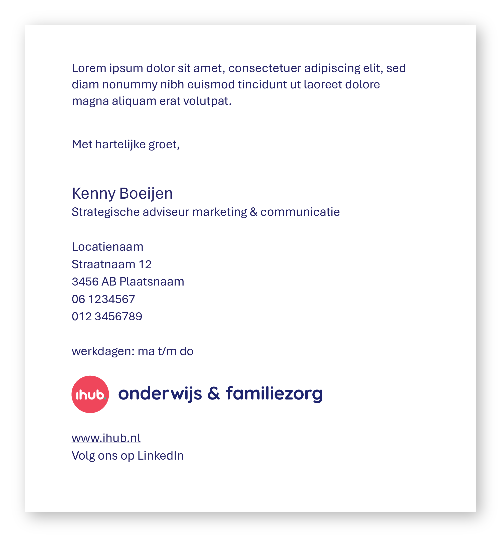 Iedere categorie heeft een eigen kleur. Die kleur heeft de voorkeur en gebruiken we het meest. De organisatiebrede kleuren blauw (vooral voor tekst) en rood komen op de tweede plaats. iHub-groen en de overige kleuren komen op respectievelijk de derde en vierde plaats.